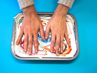 Y para trabajar con las manos, hoy os proponemos una actividad muuuuy divertida. Vamos a hacer papel marmolado, y para ello, podéis elegir una de las dos técnicas que os mostramos, o si tenéis ganas, podéis hacer las dos.