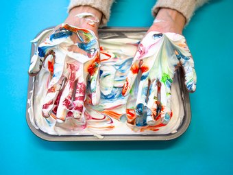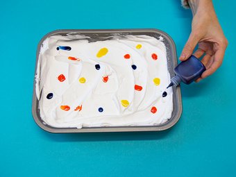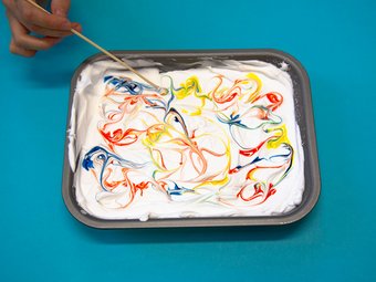 Mientras los hacéis, podéis ir nombrando los colores, observar cómo se mezclan, hablar sobre la textura de la espuma, si está fría o caliente...
