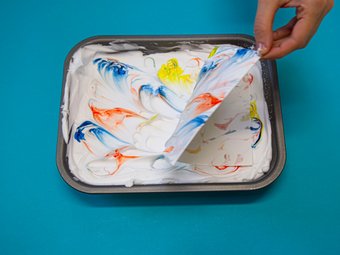 Materiales: espuma de afeitar, fuente un poco honda, palitos de madera o palillos, colorante alimentario o pintura de manos de diferentes colores, un folio, una espátula y una regla.