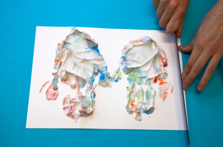 La primera parte del proceso es la misma, pero una vez que hayan mezclado los colores, tienen que colocar las manos sobre la espuma y plasmarlas sobre el folio. Después extendéis la espuma con la regla.